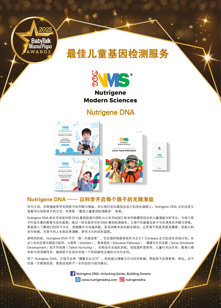 更特别的是,Nutrigene DNA 不只“测一次就结束”,它还提供独家研发的 N.E.S.T. Compass 全方位成长咨询计划。长达三年的无限次跟进与指导,从营养(Nutrition)、教育规划(Education Pathways)、情绪与社交发展(Socio-Emotional Development)到才华培育(Talent Nurturing),全程由专业团队护航,包括遗传营养师、儿童行为治疗师、教育心理学家与资深辅导员,确保孩子在成长的每一个阶段都有正确的方向与支持。